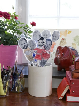 Het is altijd leuk om je te omringen met foto's van de mensen waar je om geeft. Dit hoeft niet altijd in een lijstje te zijn zoals Trine Thorsen hier laat zien. Met name de getekende figuurtjes met foto hoofdjes vind ik erg leuk. En de Zoe de Las Cases figuren als het meisje met het blauwe kroontje is ook een absolute favoriet.